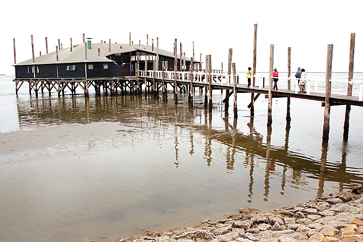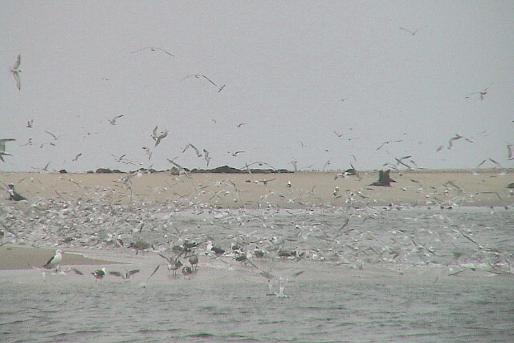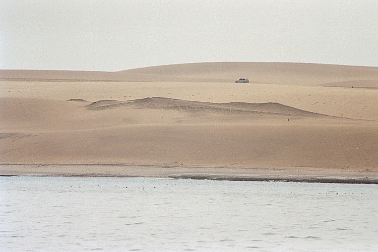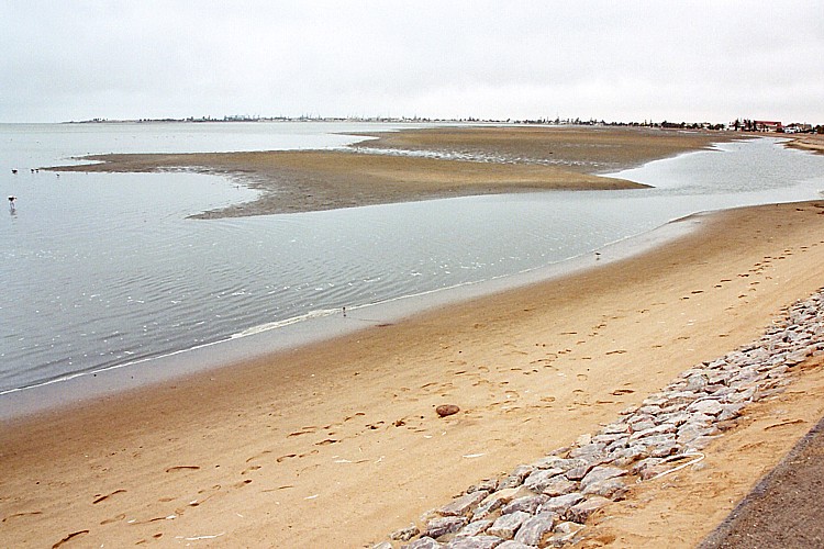 ペリカンポイントの砂洲の内側は広大な干潟、ラグーンが広がる。 |