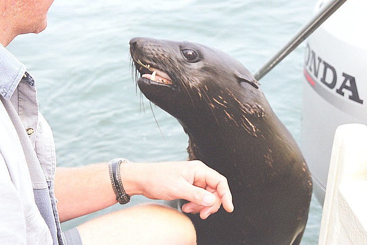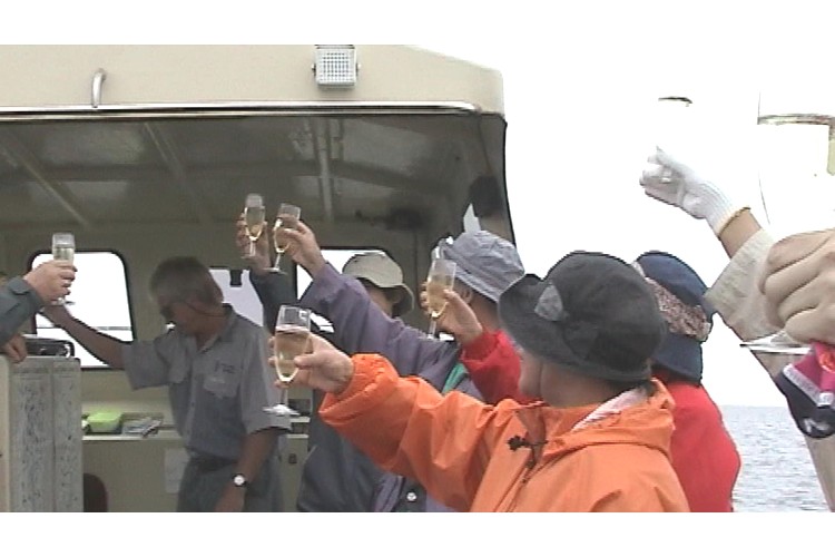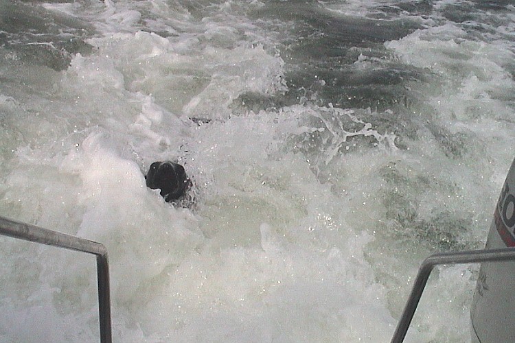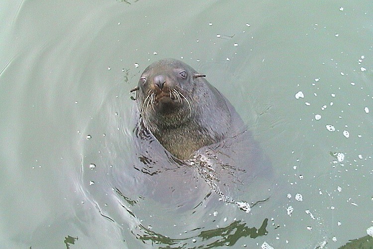 湾内を進んでいると、何かが観光船を追い掛けて来る。 |