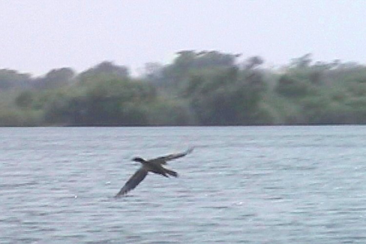チョベ川沿いの木々に留まっていたカワウが、カヌーに驚いて飛び立った。