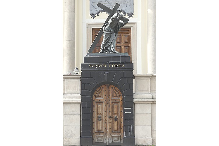 大聖堂の正面ファサードに建つ、十字架を担うキリスト像。 |