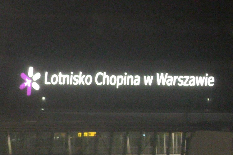 空港の看板、ワルシャワ・ショパン空港とある。