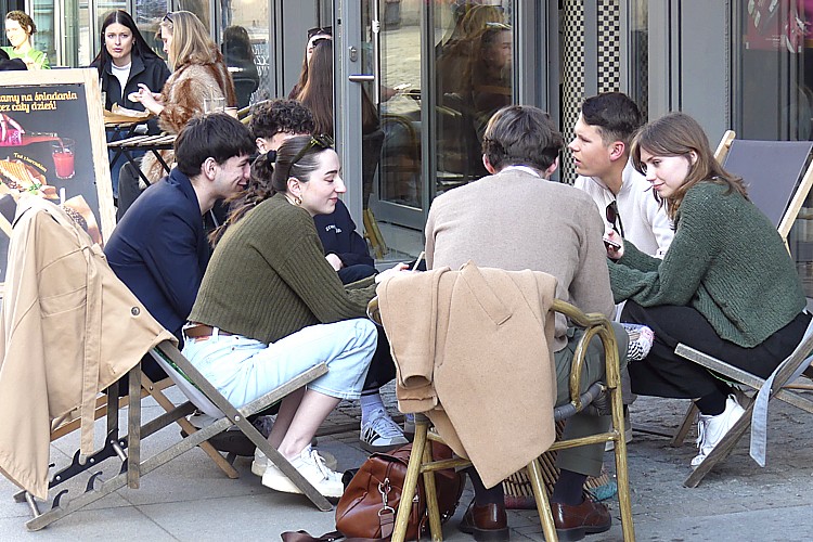 通りの店のオープン・テラスで和む、市民の若者。 |