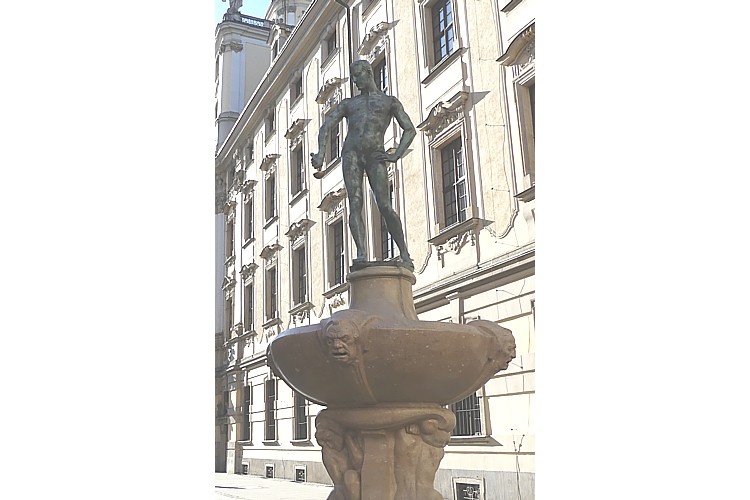 大学前の広場、ウニベルシテツキ広場に建つのは、剣士の彫刻の噴水。 |