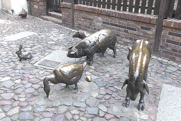 仔牛やヤギ、ブタ、卵を産んでいるガチョウ、ウサギの像がある。