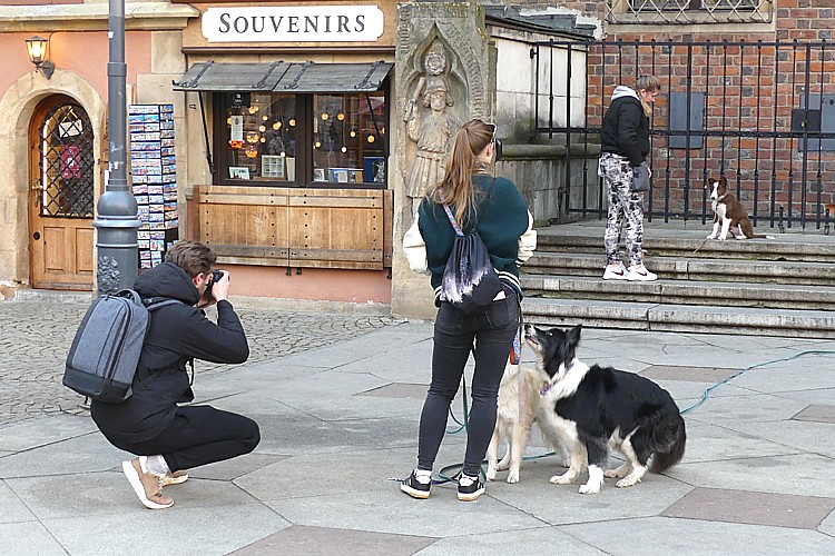 旧市庁舎前で、ペットのワンちゃん達と記念撮影する地元の人達。 |