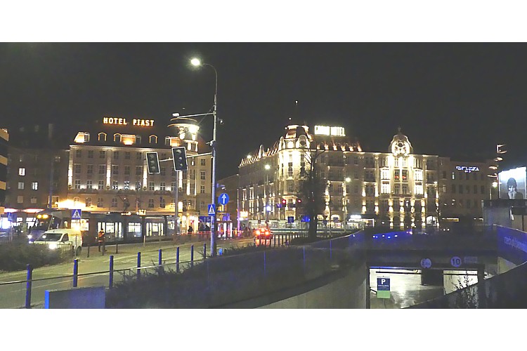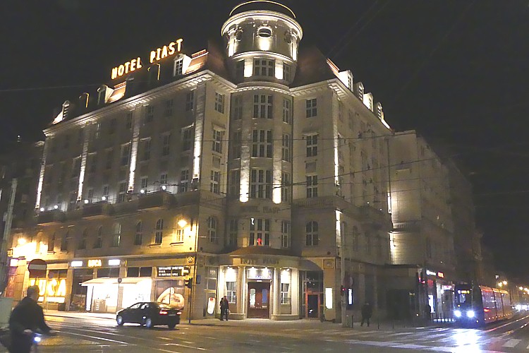 ヴロツワフ中央駅前のホテル・ピアストの夜景。