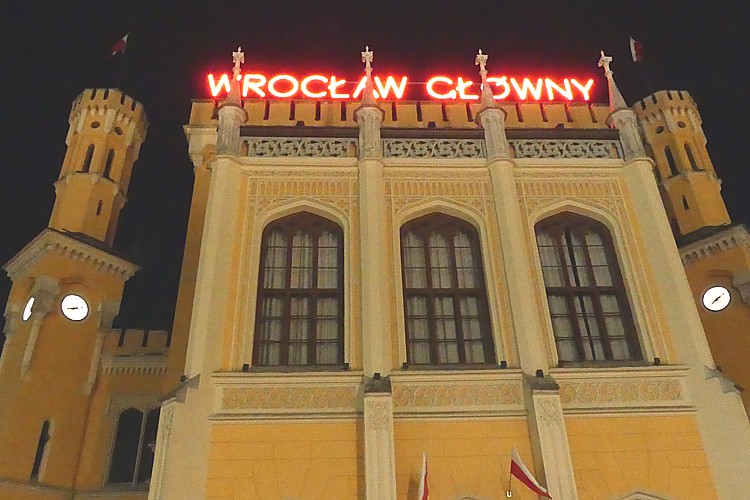 ライトアップされた、ヴロツワフ中央駅の北側駅舎。 |