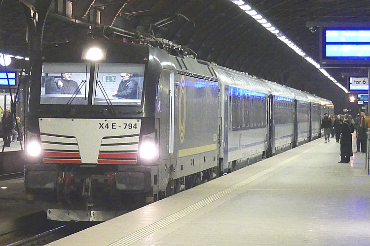 このモダンな電気機関車の列車は、寝台車も連結するユーロシティ。