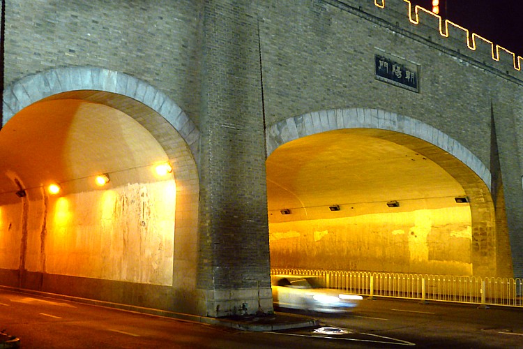 西安市内、城壁や楼閣など、暗くなってからは観光用にライトアップされる。