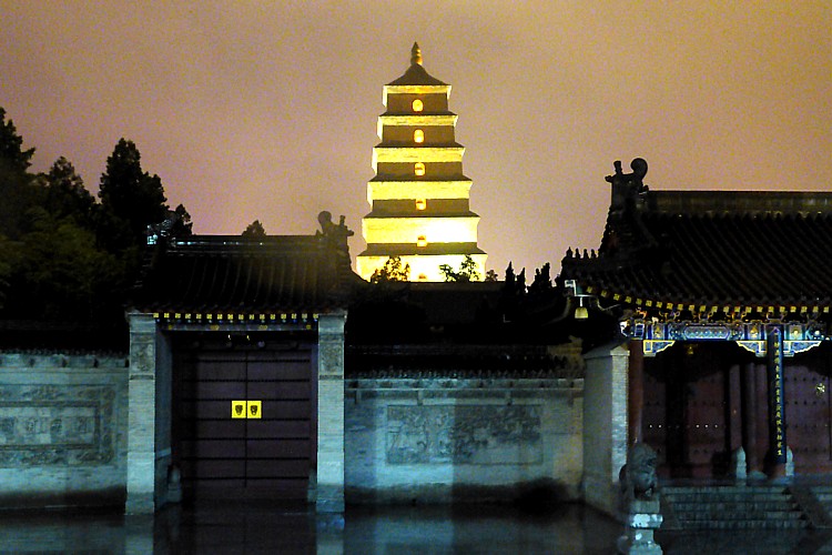 大慈恩寺の北側広場では、ライトアップされた大雁塔を背景に、音楽と光と噴水のショーが行われる。