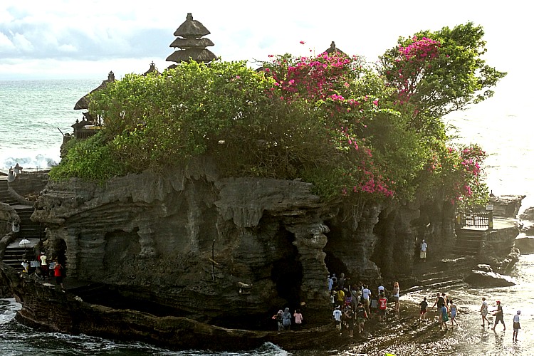 バリ島での定番の観光スポットの一つとなっている、海に浮かび波に洗われる美しいタナ・ロット寺院だが、その波による浸食が深刻で、景観を守るために日本も政府開発援助による支援を行っている。