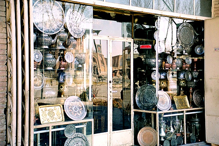 このお店では彫刻が美しい絵皿や壺、水差しなどの金属製の工芸品を売っている。