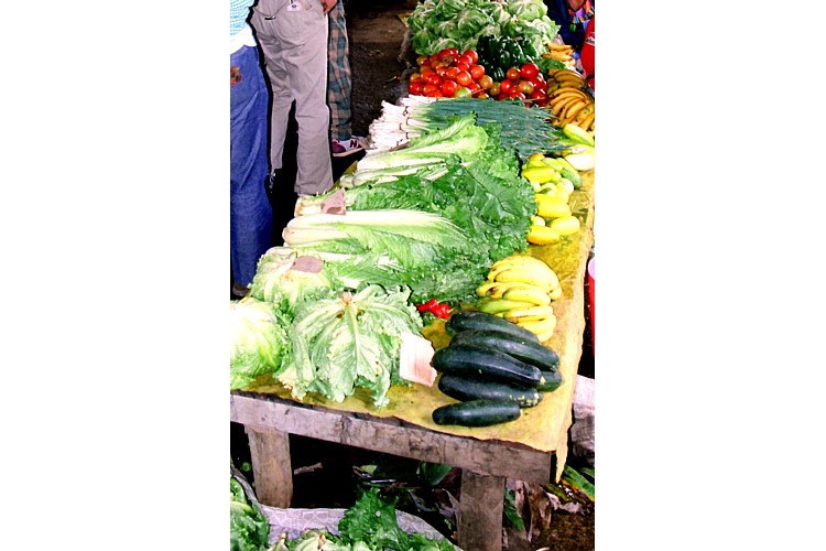 中央の緑の野菜は日本で見るインゲンマメの様な、さやごと食べる細長いサヤインゲンに似ている。 |